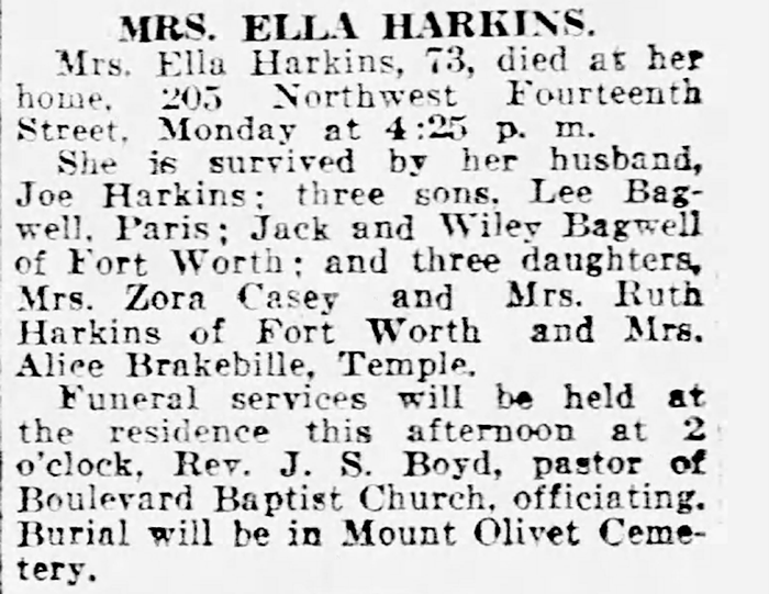 She is survived by one son, J.A. Bagwell and wife, Linda, of Weatherford; three daughters, Bonnie Wallace and husband, Charles, of Weatherford, Patricia Eldridge and husband, Jerry, of Columbus, Ohio, and Lenora Scozzari of Tulsa, Okla; eight grandchildren, Regina Eldridge and Jerry Eldridge of Columbus, Ohio, Brenda Massey of Seattle, Wash., Charles Wallace Jr. of Waseca, Minn., Jennifer Wilson of Centreville, Md., Charles Goins of Weatherford, Jansen Bagwell of Casper, Wyo., and Tara Howard of Diane, Texas; 13 great-grandchildren and numerous nieces and nephews.