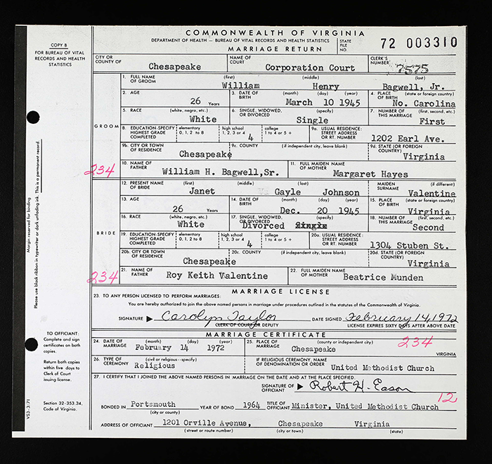 Janet Gayle Valentine married William Henry Bagwell Jr., son of William Henry Bagwell Sr. and Margaret Marie Hayes, on 14 February 1972 at Chesapeake, Virginia.