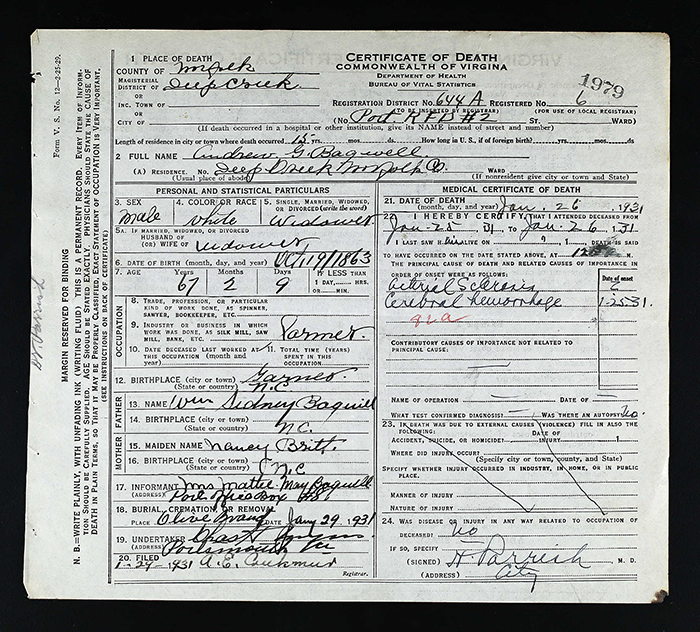 Andrew Green Bagwell was born on 19 October 1863 in North Carolina.1 He was the son of William Sidney Bagwell and Nancy Britt. Andrew Green Bagwell married Irene Whitley on 20 February 1889 at Johnston County, North Carolina. Andrew Green Bagwell died on 26 January 1931 in Deep Creek, Norfolk County, Virginia, at age 67.1 He was buried on 29 January 1931 at Olive Branch Cemetery, Portsmouth, Posrtmouth City, Virginia.1
