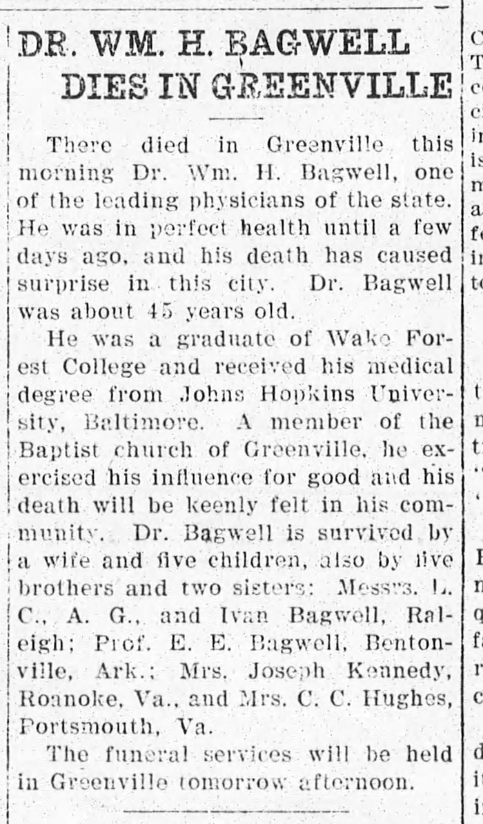 Dr. William Henry Bagwell was also known as William H. Bagwell M.D. He was born on 1 April 1852 in North Carolina. He was the son of William Sidney Bagwell and Nancy Britt. Dr. William Henry Bagwell married Nancy Dorothy Speir on 9 February 1887 at Pitt County, North Carolina. Dr. William Henry Bagwell died on 7 April 1908 in Greenville, Pitt County, North Carolina, at age 56. He was buried on 8 April 1908 at Greenville, North Carolina.