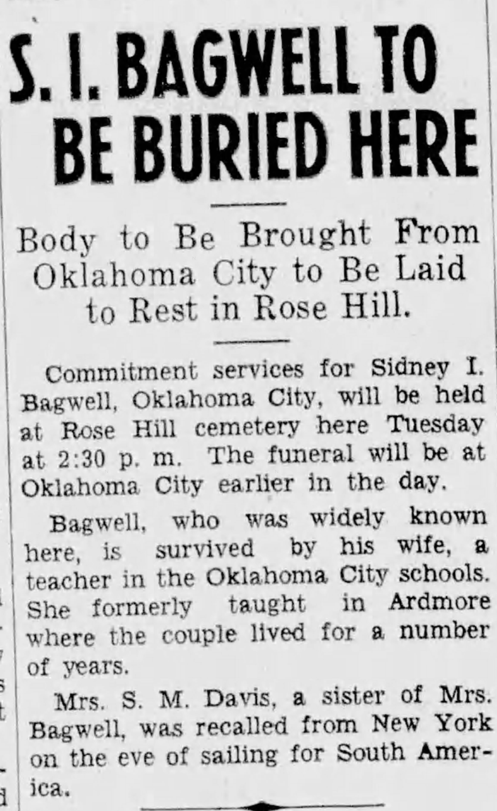 Sidney I. Bagwell was born in March 1869 in North Carolina. He was the son of William Sidney Bagwell and Nancy Britt. Sidney I. Bagwell married Mary E. Thompson on 2 September 1896 at McLennan County, Texas. Sidney I. Bagwell lived in 1900 in Pauls Valley, Chickasaw Nation, Indian Territory. He died before 30 December 1935 in Oklahoma City, Oklahoma County, Oklahoma. He was buried on 31 December 1935 at Rose Hill Cemetery, Ardmore, Carter County, Oklahoma.