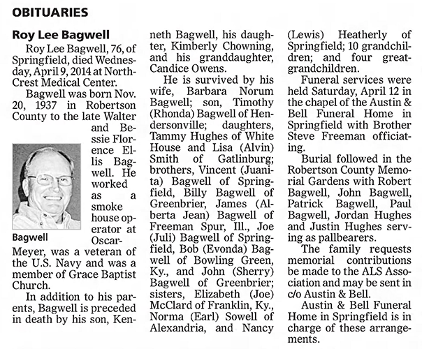 Roy Lee Bagwell, age 76, of Springfield, passed away Wednesday, April 9, 2014 at NorthCrest Medical Center. Funeral Services will be held Saturday, April 12, 2014 at 1pm in the chapel of the Austin & Bell Funeral Home in Springfield with Brother Steve Freeman officiating. Burial will follow in the Robertson County Memorial Gardens with family and friends serving as pallbearers. Visitation with the family will be held at the funeral home on Friday, April 11, 2014 from Noon until 8pm and again Saturday morning from 11am until the hour of service.