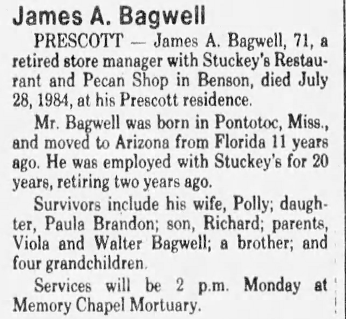 James Alvis Bagwell was also known as Alvis Bagwell. He was born on 13 October 1912 in Pontotoc, Mississippi. He was the son of James Walter Bagwell and Viola Lillie Westmoreland. James Alvis Bagwell married Lois Cothram on 18 February 1934 at Cross County, Arkansas. James Alvis Bagwell married Pauline W. (?) after 1935. James Alvis Bagwell lived in 1940 in Rural, Cross County, Arizona. He was a US Army veteran of World War II and was injured in battle by a artillery shell fragment and was admitted into the hospital on September 1944. He died on 28 July 1984 in Prescott, Arizona, at age 71. He was buried at Mountain View Cemetery, Prescott, Yavapai County, Arizona.