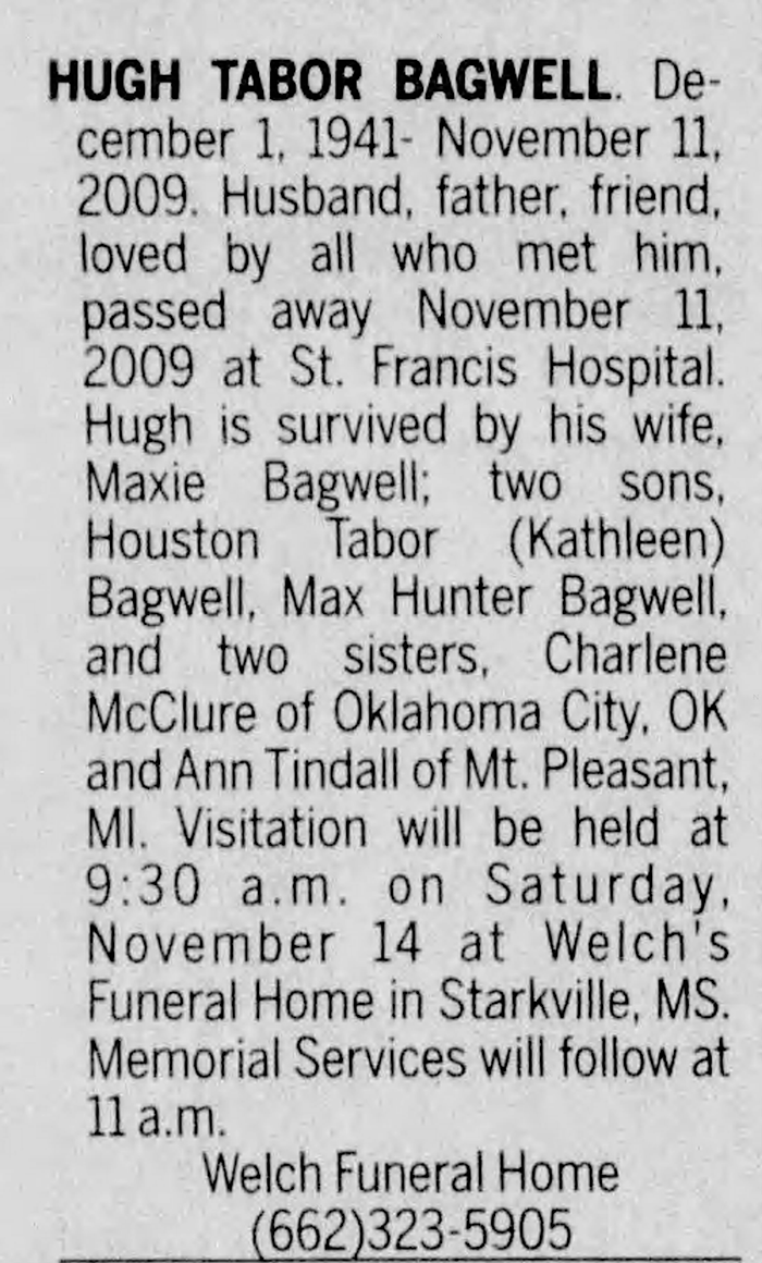 Hugh Tabor Bagwell was born on 1 December 1941 in Massachusetts.1 He was the son of Robert Bagwell and Laura Scott. Hugh Tabor Bagwell lived in 1956 in Mississippi. He married Maxie Joe Hunt before 1968. Hugh Tabor Bagwell died on 11 November 2009 in Memphis, Tennessee, at age 67.1 He was buried on 14 November 2009 at Sturgis Cemetery, Sturgis, Oktibbeha County, Mississippi.1