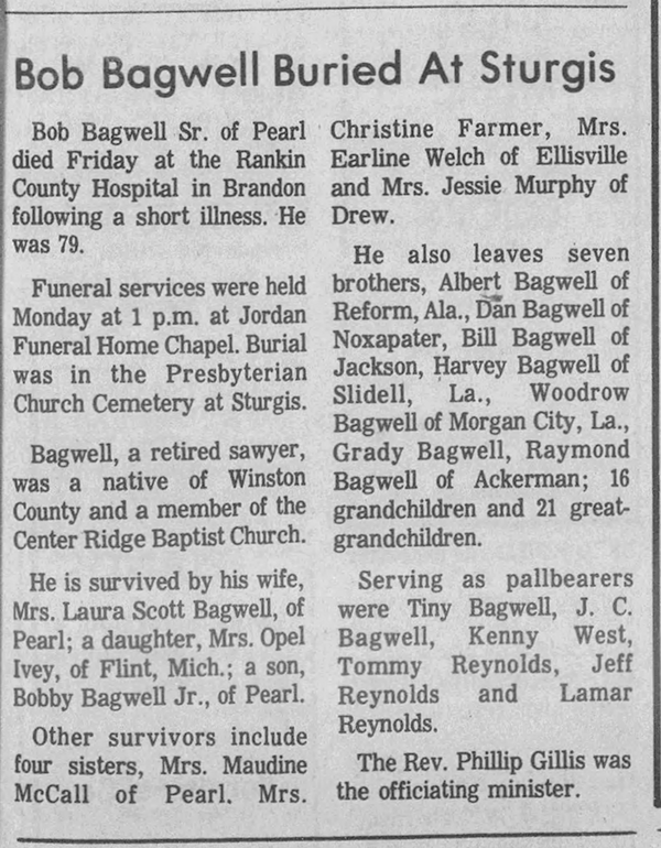Robert Bagwell was born on 28 August 1897 in Winston County, Mississippi.1 He was the son of Samuel Whitfield Bagwell and Sallie T. Hollis. Robert Bagwell married Laura Scott before 1921 at Mississippi. Robert Bagwell died on 17 December 1976 in Pearl, Rankin County, Mississippi, at age 79.1 He was buried on 27 December 1976 at Sturgis Cemetery, Sturgis, Oktibbeha County, Mississippi.1
