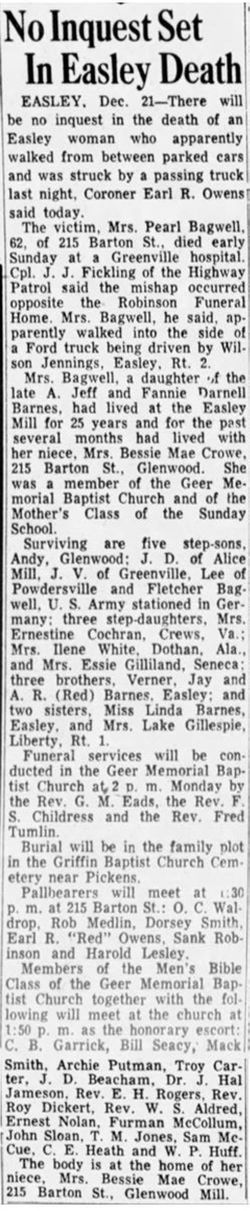 Pearl Barnes was also known as Pearl Hatcher. She was born in 1890 in Pickens County, South Carolina. As of before 1940,her married name was Bagwell. She married William Robert Bagwell, son of Calvin Lynch Bagwell and Margaret Melissa Lesley, before 1940. Pearl Barnes died on 21 December 1952 in Greenville, Greenville County, South Carolina. She was buried at Griffin Baptist Church Cemetery, Pickens, Pickens County, South Carolina.
