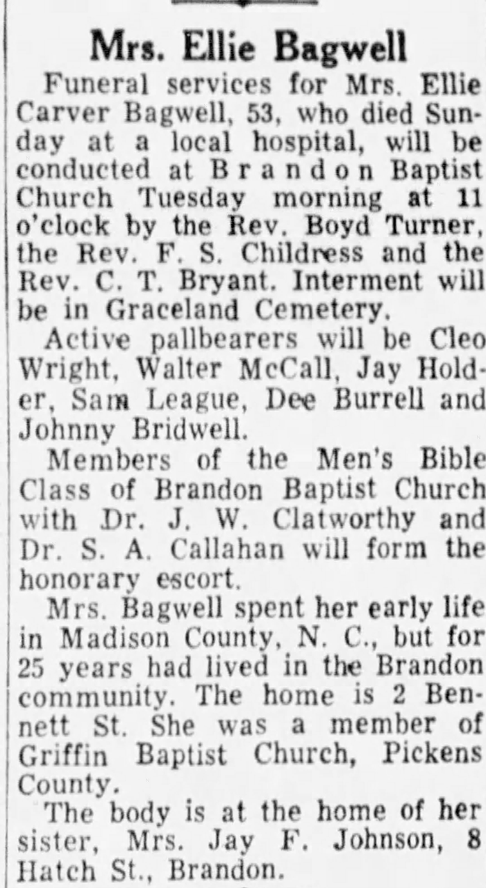 Ellie Jane Carver was born on 7 March 1900 in Madison County, North Carolina. As of after 1915,her married name was Bagwell. She married James Marcus Bagwell, son of Calvin Lynch Bagwell and Margaret Melissa Lesley, after 1915. Ellie Jane Carver died on 5 April 1953 in Greenville, Greenville County, South Carolina, at age 53. She was buried on 7 April 1953 at Graceland West Cemetery and Mausoleum, Greenville, Greenville County, South Carolina.