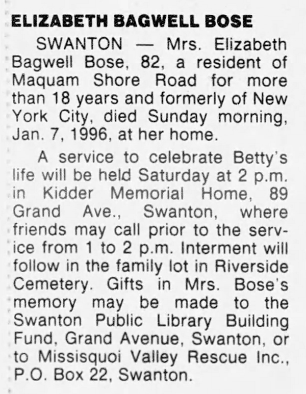 Elizabeth Bagwell was born on 14 July 1913 in Manhattan, New York City, New York.1 She was the daughter of Eugene Campbell Bagwell and Ina B. Redpath. As of after 1930,her married name was Bose. Elizabeth Bagwell married John Bose after 1930. Elizabeth Bagwell died on 7 January 1996 in Swanton, Vermont, at age 82 died of Carcinoma of the Bowel.1 She was buried at Riverside Cemetery, Swanton, Frankin County, Vermont.1