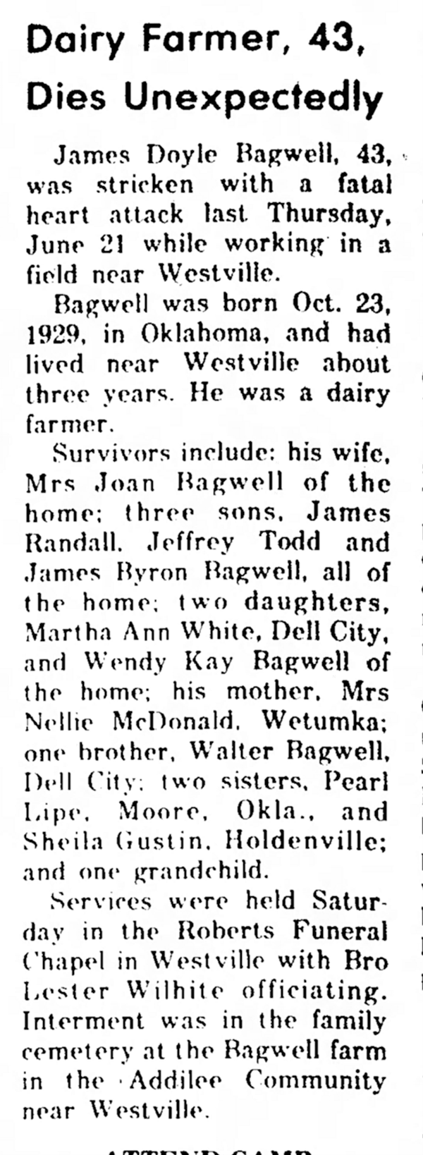 James Doyle Bagwell was born on 29 October 1929 in Oklahoma. He was the son of James Berry Bagwell and Nellie Opal Smith. James Doyle Bagwell married Geraldine Livesy on 21 August 1948 at Wewoka, Seminole County, Oklahoma. James Doyle Bagwell died on 21 June 1973 in Stillwell, Adair County, Oklahoma, at age 43. He was buried on 23 June 1973 at Bagwell Farm Cemetery, Addilee Community, Oklahoma.
