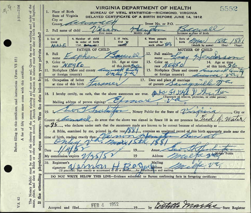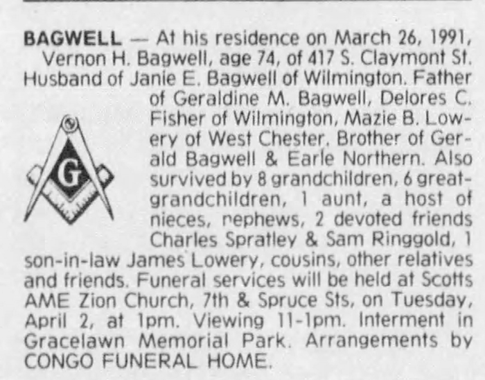 Vernon Hampton Bagwell Jr. was born on 1 October 1916 in Savageville, Virginia. He was the son of Vernon Hampton Bagwell and Annie R. Paddy. Vernon Hampton Bagwell Jr. married Janie Elizabeth Marshall on 22 November 1939 at Savageville, Virginia. Vernon Hampton Bagwell Jr. lived on 22 October 1986 in Wilmington. He died on 26 March 1991 in Wilmington, Delaware, at age 74. He was buried on 2 April 1991 at Gracelawn Memorial Park, New Castle, New Castle County, Delaware.