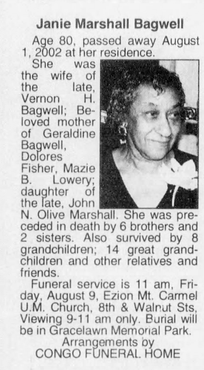 Janie Elizabeth Marshall was born on 29 July 1922. As of 22 November 1939,her married name was Bagwell. She married Vernon Hampton Bagwell Jr., son of Vernon Hampton Bagwell and Annie R. Paddy, on 22 November 1939 at Savageville, Virginia. Janie Elizabeth Marshall died on 1 August 2002 at age 80. She was buried on 9 August 2002 at Gracelawn Memorial Park, New Castle, New Castle County, Delaware.