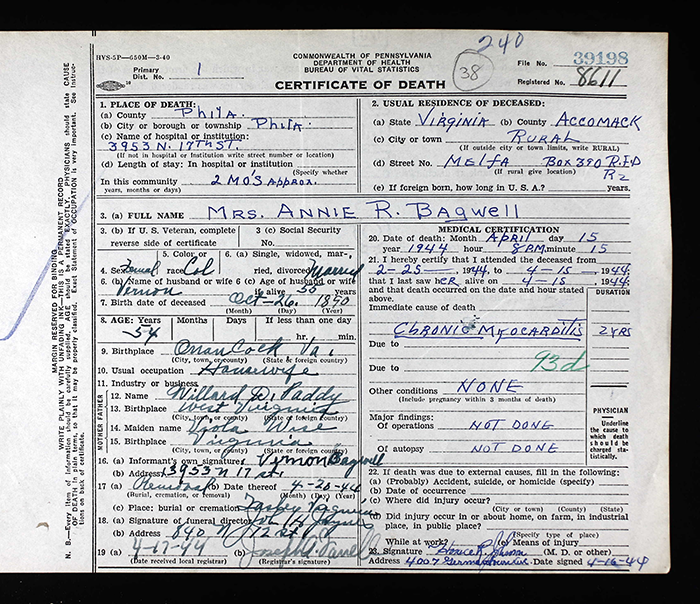 Annie R. Paddy was also known as Annie R. Pattie. Annie R. Paddy was also known as Annie Rich Paddy. Annie R. Paddy was also known as Annie Rich. She was born in 1881 in Onancock, Accomack County, Virginia. She married Vernon Hampton Bagwell, son of Ephraim Bagwell Jr. and Lucy Henderson, on 25 September 1902 at Accomack County, Virginia. As of 25 September 1902,her married name was Bagwell. Annie R. Paddy died on 15 April 1944 in Philadelphia, Philadelphia County, Pennsylvania.