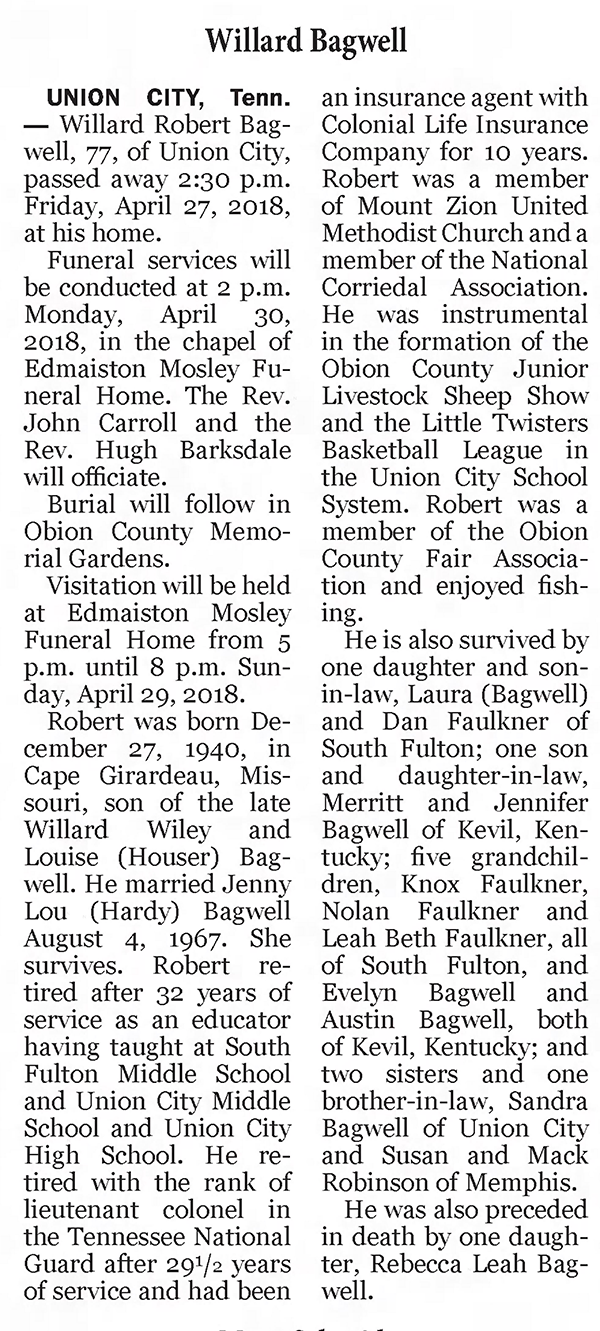 Willard Robert Bagwell was born on 27 December 1940 in Cape Girardeau County, Missouri. He was the son of Willard Wiley Bagwell and Martha Louise Houser. Willard Robert Bagwell married Jenny Lou Hardy on 4 August 1967. Willard Robert Bagwell died on 27 April 2018 at age 77. He was buried at Obion County Memorial Gardens, Union City, Obion County, Tennessee.