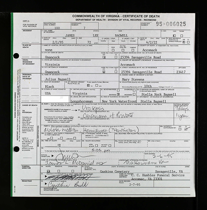 James Lee Bagwell was born on 2 April 1922 in Accomack County, Virginia. He was the son of Julius Raymond Bagwell and Mary Magdalene Stevens. James Lee Bagwell married Lelia Mae Savage on 27 September 1942 at Melfa, Accomack County, Virginia. James Lee Bagwell married Stella Nock before 1994. James Lee Bagwell died on 1 February 1995 in Accomack County, Virginia, at age 72. He was buried at Gaskins Chapel AME Church Cemetery, Savageville, Accomack County, Virginia.