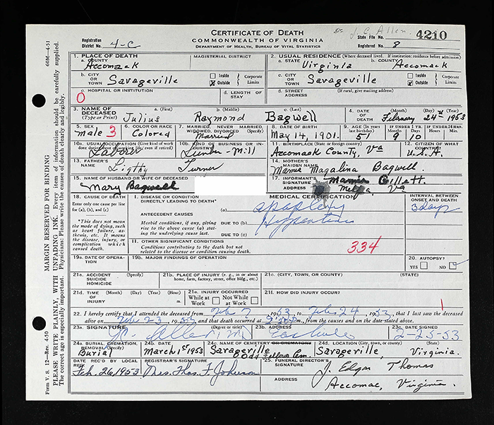 Julius Raymond Bagwell was also known as Julius Roland Bagwell. He was born on 14 May 1901 in Accomack County, Virginia. He was the son of Ligthy Turner and Mamie Magalina Bagwell. Julius Raymond Bagwell married Mary Magdalene Stevens on 29 May 1921 at Savageville, Accomack County, Virginia. Julius Raymond Bagwell died on 24 February 1953 in Savageville, Accomack County, Virginia, at age 51. He was buried on 1 March 1953 at Odd Fellows Cemetery, Savageville, Accomack County, Virginia.