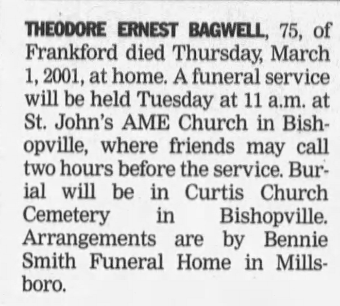 Theodore Ernest Bagwell was born on 8 May 1926 in Savageville, Virginia. He was the son of Julius Raymond Bagwell and Mary Magdalene Stevens. Theodore Ernest Bagwell married Hester Margaret Beckett on 26 July 1947 at Savageville, Accomack County, Virginia. Theodore Ernest Bagwell married Dorothy Frances Bracy after 1950. Theodore Ernest Bagwell died on 1 March 2001 in Selbyville, Sussex County, Delaware, at age 74. He was buried on 6 March 2001 at Saint John A.M.E. Church Cemetery, Bishopville, Worchester County, Maryland.
