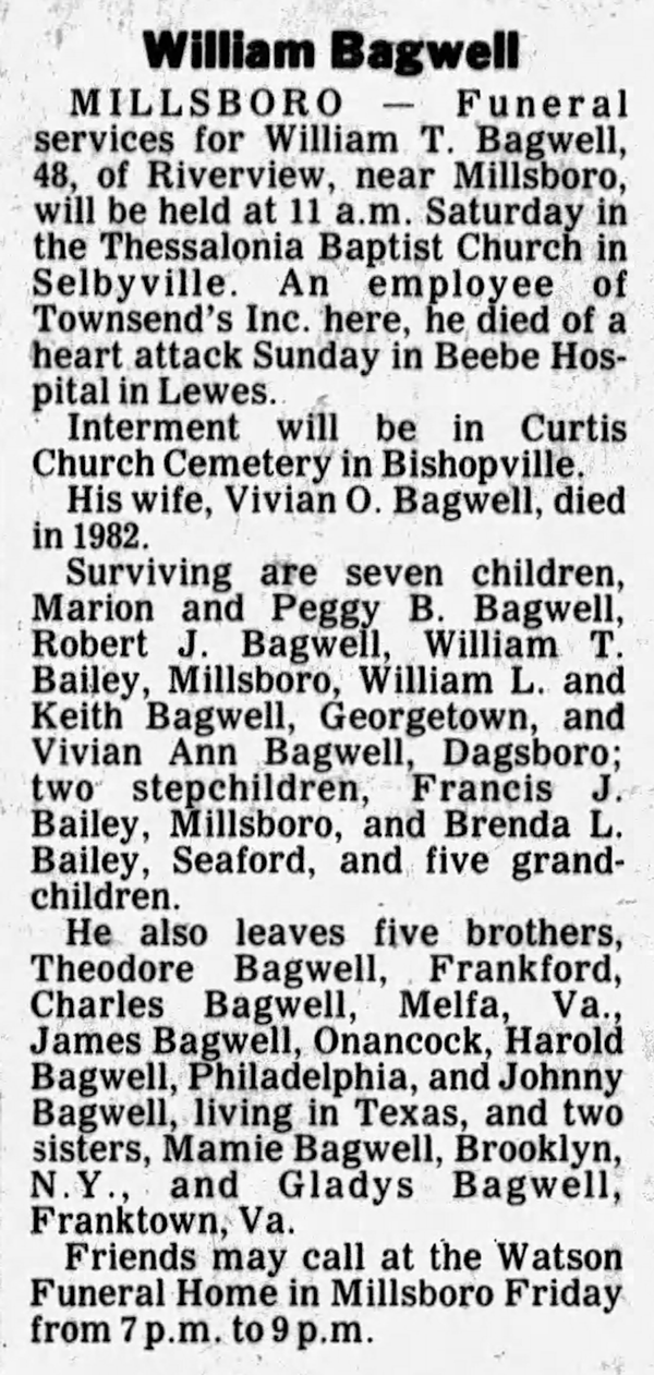 William Thomas Bagwell was born on 26 August 1936 in Savageville, Virginia. He was the son of Julius Raymond Bagwell and Mary Magdalene Stevens. William Thomas Bagwell married Vivian Odetta Bailey on 15 January 1962 at Accomac County, Virginia. William Thomas Bagwell died on 28 April 1985 at age 48 of a heart attack. He was buried on 4 May 1985 at Curtis Cemetery, Bishopville, Worchester County, Maryland.