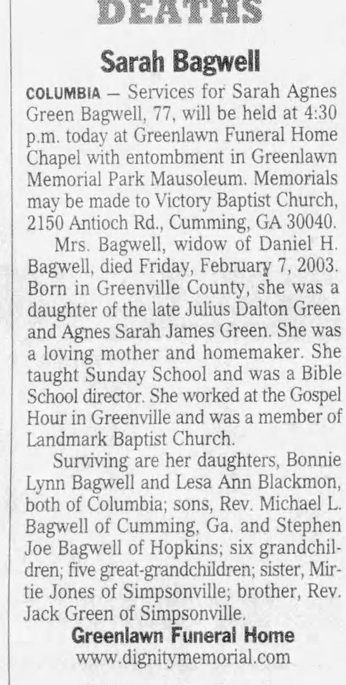 Sarah Agnes Greene was born on 18 January 1926 in South Carolina.1 As of circa 1946,her married name was Bagwell.1 She married Daniel Howard Bagwell, son of Oscar Henry Bagwell and Lillian Eva Henderson, circa 1946.1 Sarah Agnes Greene died on 7 February 2003 in Greenville County, South Carolina, at age 77.1 She was buried on 9 February 2003 at Greenlawn Memorial Park, Columbia, Richland County, South Carolina.1
