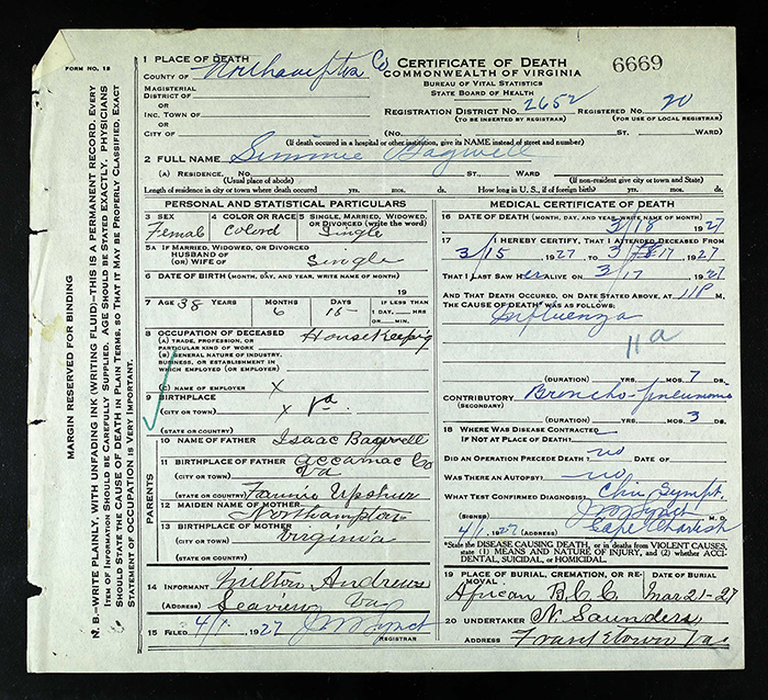Sumner Fairfield Bagwell was also known as Simmie Bagwell. He was born on 31 December 1879 in Northampton County, Virginia. He was the son of Isaac Bagwell and Fanny Upshur. Sumner Fairfield Bagwell died on 17 March 1927 in Northhampton County, Virginia, at age 47. He was buried on 21 March 1927 at African Baptist Church Cemetery, Cheriton, Northhampton County, Virginia.