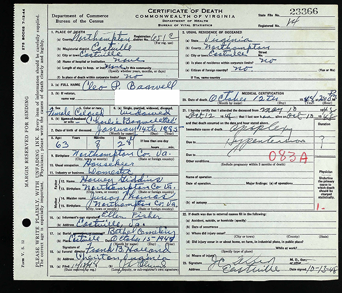 Cleo P. Giddings was born on 14 January 1885 in Northampton County, Virginia.1 As of 13 November 1907,her married name was Bagwell. She married Charles Bagwell, son of Isaac Bagwell and Fanny Upshur, on 13 November 1907 at Northampton County, Virginia. Cleo P. Giddings died on 12 October 1948 in Eastville, Northampton County, Virginia, at age 63.1 She was buried at Bethel AME Church Cemetery, Eastville, Northampton County, Virginia.1