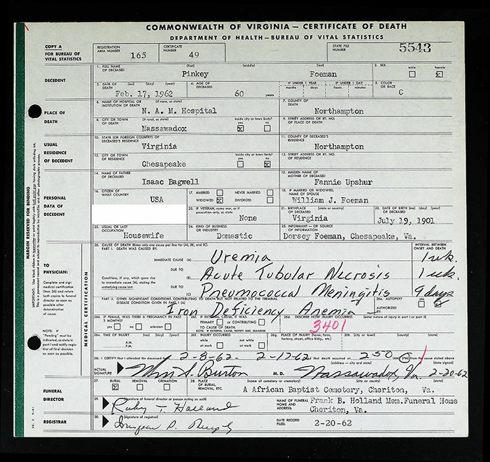 Pinky Bagwell was also known as Pinkey Bagwell. She was born in June 1888 in Virginia. She was the daughter of Isaac Bagwell and Fanny Upshur. As of 14 October 1908,her married name was Foeman. Pinky Bagwell married William Foeman on 14 October 1908 at Northampton County, Virginia. Pinky Bagwell died on 17 February 1962 in N.A.M. Hospital, Nassawadox, Northhampton County, Virginia, at age 73. She was buried on 20 February 1962 at African Baptist Church Cemetery, Cheriton, Northhampton County, Virginia.