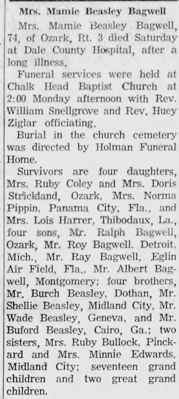 - William Baxley Bagwell+8 b. 7 Mar 1883, d. 6 Oct 1970