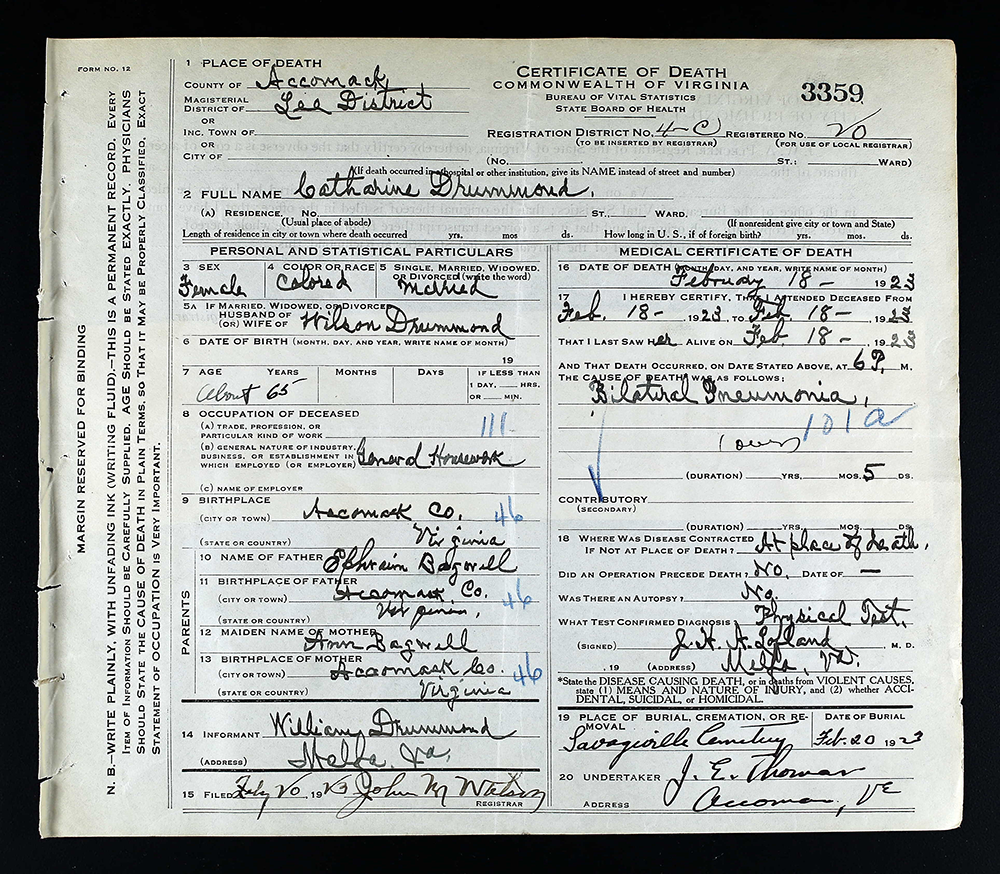 Catherine Kate Bagwell was born in March 1859 in Accomack County, Virginia. She was the daughter of Ephraim Bagwell and Ann Phillips.1 As of 26 November 1876,her married name was Conquest. Catherine Kate Bagwell married Edward Conquest on 26 November 1876 at Savageville, Virginia. As of 4 January 1891,her married name was Drummond. Catherine Kate Bagwell married Wilson Drummond on 4 January 1891 at Savageville, Accomack County, Virginia.1 Catherine Kate Bagwell died on 18 February 1923 in Accomack County, Virginia, at age 63 of bilateral pneumonia.1 She was buried on 20 February 1923 at Savageville Cemetery, Accomack County, Virginia.1