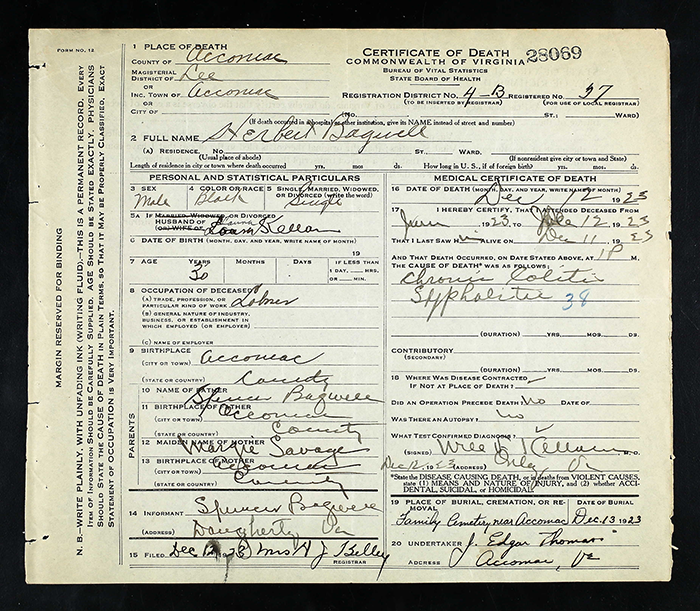 - [S7252] Herbert Bagwell, Commwealth fo Virginia Certificate of Death: Herbert Bagwell.