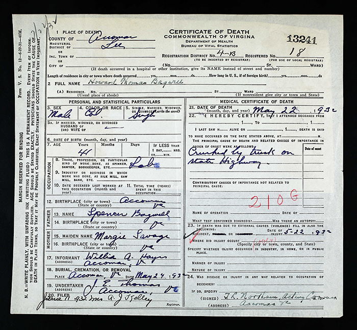 - [S7251] Howard Thomas Bagwell, Commwealth fo Virginia Certificate of Death: Howard Thomas Bagwell.