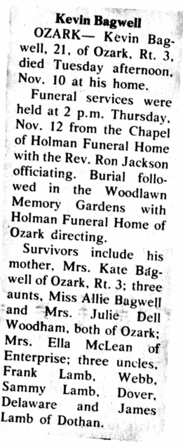 John Kevin Bagwell was born on 11 January 1960. He was the son of John Bagwell and Kate L. (?) John Kevin Bagwell died on 10 November 1981 at age 21. He was buried at Woodlawn Memorial Gardens, Ozark, Dale County, Alabama.