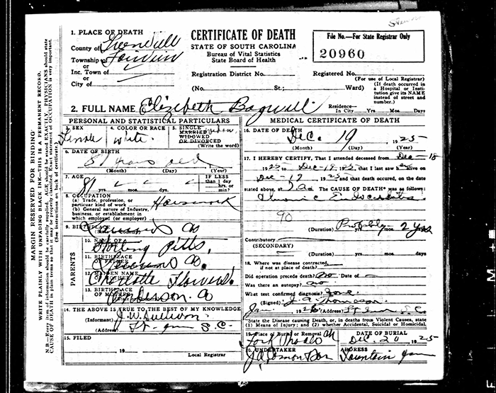 Elizabeth Suza Pitts was born in 1845 in Laurens County, South Carolina.1 She married John Bagwell, son of Joseph (Jasper) Bagwell and Frances A. (?), before 1870. As of before 1870,her married name was Bagwell. Elizabeth Suza Pitts died on 19 December 1925 in Greenville County, South Carolina.1 She was buried on 20 December 1925 at Fork Shoals Baptist Church Cemetery, Pelzer, Greenville County, South Carolina.1