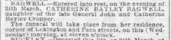 Catherine Bayley Cropper was born circa 1800. As of 14 August 1826,her married name was Bagwell. She married Augustus W. Bagwell, son of Colonel Charles Bagwell and Nancy 'Ann' Grinalds, on 14 August 1826 at Snow Hill, Worcester County, Maryland. Catherine Bayley Cropper died on 24 March 1879 in Baltimore, Maryland.
