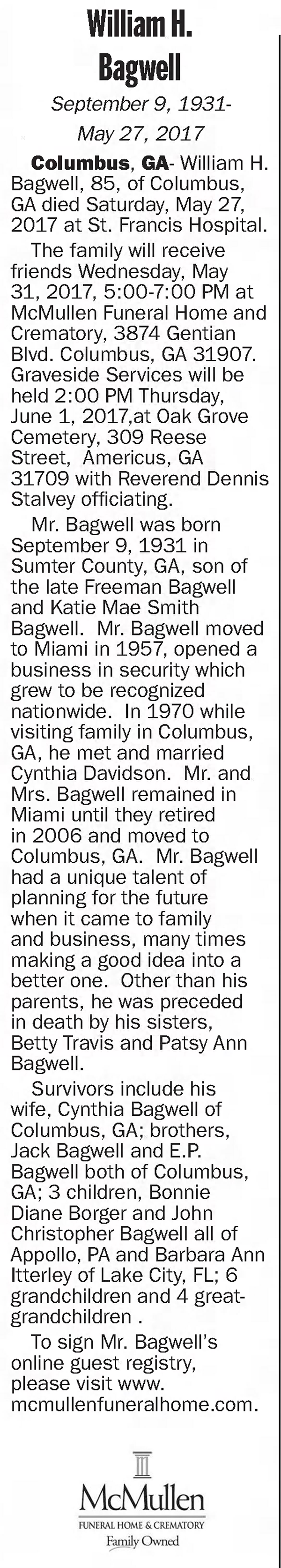 William H. Bagwell, 85, of Columbus, GA died Saturday, May 27, 2017 at St. Francis Hospital.
