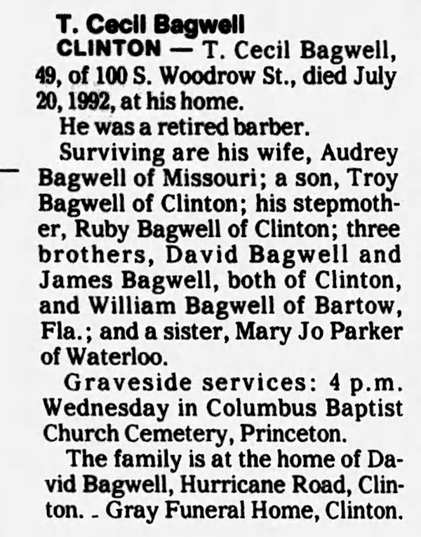 - Thomas Cecil Bagwell+ b. 2 Jun 1942, d. 20 Jul 1992