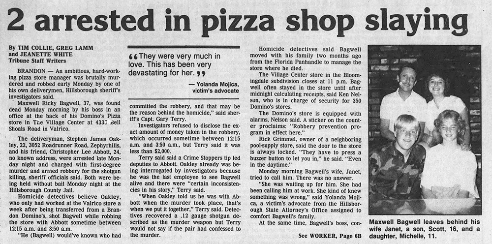 Maxwell Rickey Bagwell was born on 7 October 1952 in Ozark, Dale County, Alabama. He was the son of Maxwell Zinnamon Bagwell and Levonia Galloway. Maxwell Rickey Bagwell married Sherryl Sue Speigner on 8 October 1971 at Bay County, Florida. Maxwell Rickey Bagwell married Janet Kay Taylor on 21 April 1987 at Bay County, Florida. Maxwell Rickey Bagwell died on 6 November 1989 in Hillsborough County, Florida, at age 37 He was shot to death during a robbery. He ran a Domino's Pizza store in Brandon, Florida. The robber shot him with a shotgun after midnight while Maxwell was counting the daily earnings. He was buried at Selma Baptist Church Cemetery, Dothan, Houston County, Alabama.