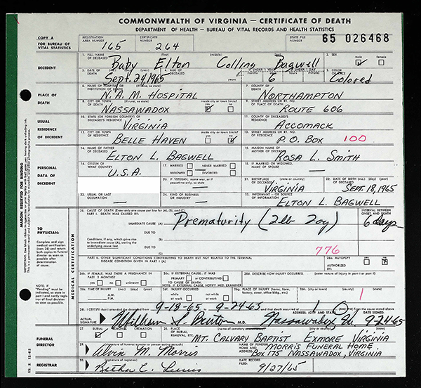 Elton Collins Bagwell was born on 18 September 1965 in Virginia.1 He was the son of Elton L. Bagwell and Rosa L. Smith. Elton Collins Bagwell died on 24 September 1965 in N.A.M. Hosptial, Nassawadox, Northhampton County, Virginia.1 He was buried at Mount Calvary Church Cemetery, Exmore, Northhampton County, Virginia.1
