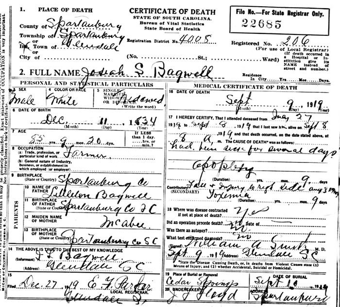 - [S1316] Josiah S. Bagwell, South Carolina Death Certificate: Josiah S. Bagwell.