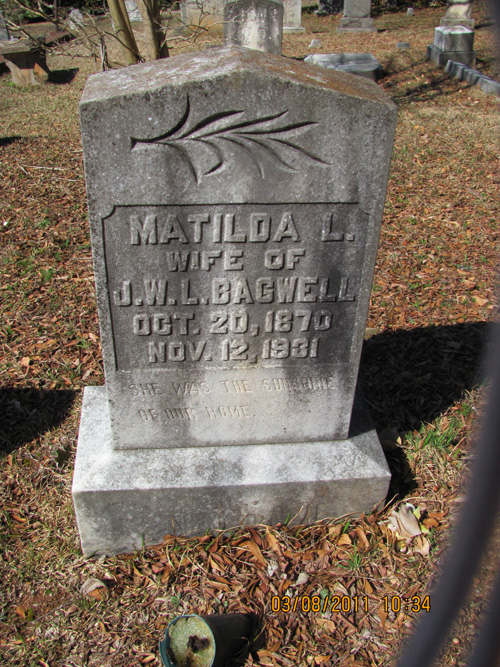 Matilda Rebecca Lankford was also known as Matilda Rebecca Lanford. She was born on 20 October 1870.1 As of 1896,her married name was Bagwell.1 She married John William Littleton Bagwell, son of Littleton P. Bagwell and Martha Ellen Gossett, in 1896.1 Matilda Rebecca Lankford died on 12 November 1931 in Spartanburg, Spartanburg County, South Carolina, at age 61.1 She was buried at Glendale Cemetery, Glendale, Spartanburg County, South Carolina.