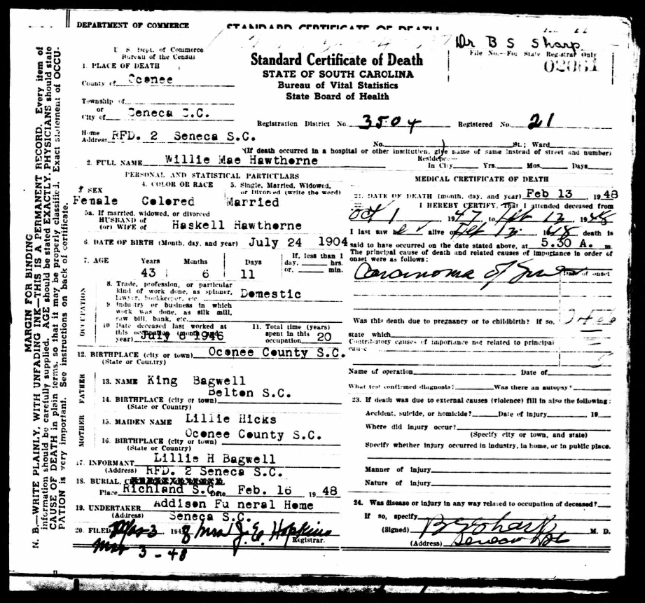 Willie Mae Bagwell was born on 24 July 1904 in Oconee County, South Carolina. She was the daughter of Reverend King Marshall Bagwell and Lillian (?) As of after 1918,her married name was Hawthorne. Willie Mae Bagwell married Haskell Hawthorne after 1918. Willie Mae Bagwell died on 13 February 1948 at age 43. She was buried on 16 February 1948 at Richland, South Carolina.