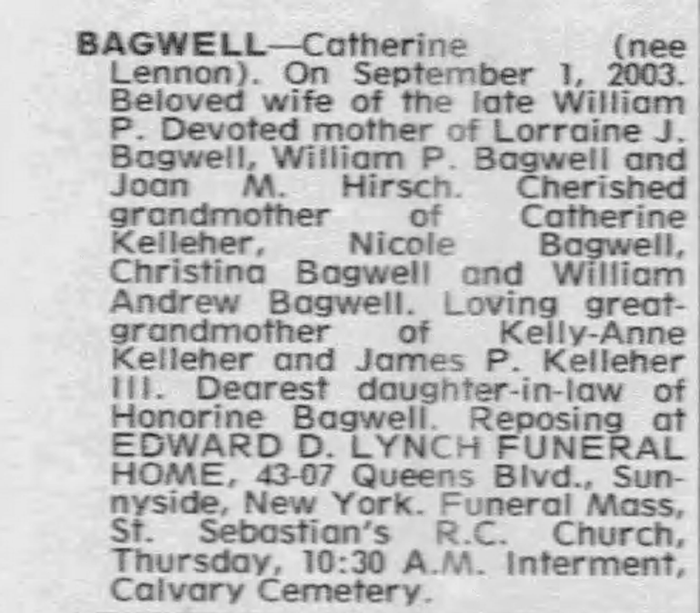 Catherine Margaret Lennon was born in August 1916 in New York City, New York. As of 3 April 1942,her married name was Bagwell. She married William Powers Bagwell, son of William J. Bagwell and Mary C. Powers, on 3 April 1942 at New York, Manhattan, New York. Catherine Margaret Lennon died on 1 September 2003 in New York, New York, at age 87. She was buried on 4 September 2003 at Calvary Cemetery, Woodside, Queens County, New York.