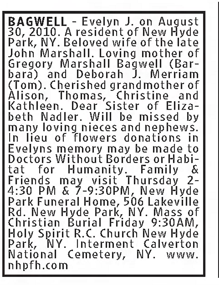 Evelyn J. Reilly was born on 15 December 1926. As of after 1945,her married name was Bagwell. She married John Marshall Bagwell, son of William J. Bagwell and Mary C. Powers, on 23 August 1947 at Manhattan, New York City, New York. Evelyn J. Reilly died on 30 August 2010 in New Hyde Park, New York, at age 83. She was buried on 3 September 2010 at Calverton National Cemetery, Calverton, Suffolk County, New York.