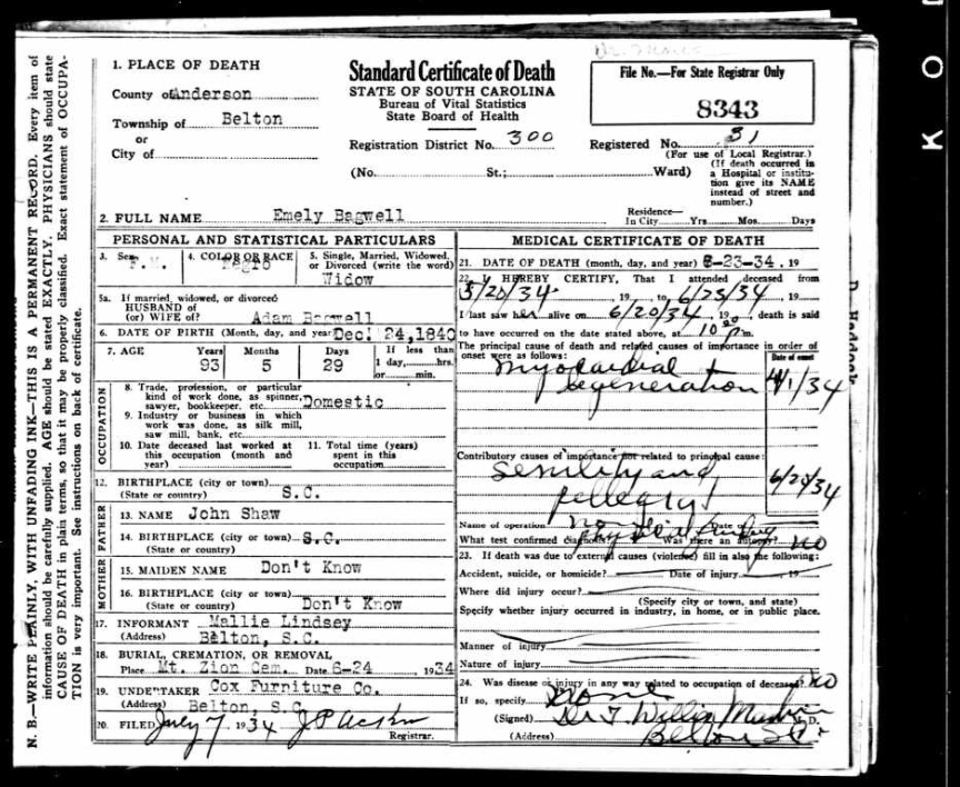 Emily Shaw was born on 24 December 1840 in South Carolina.1 As of after 1866,her married name was Bagwell. She married Adam Bagwell after 1866. Emily Shaw died on 23 June 1934 at age 93.1 She was buried on 24 June 1934 at Mt. Zion Cemetery, Belton, Anderson County, South Carolina.1