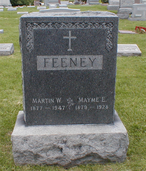 Mary E. Lewis was also known as Mayme E. Lewis. She was born circa 1881 in Pennsylvania.1 She married Martin W. (Red) Feeney, son of William Feeney and Mary Casserly, on 18 July 1906 at Indianapolis, Marion County, Indiana.4,2,3 Her married name was Feeney. Mary E. Lewis died in 1928 in Indiana. She was buried at Holy Cross Cemetery, Indianapolis, Marion County, Indiana. She and Martin W. (Red) Feeney lived in 1940 in Indianapolis, Marion County, Indiana.