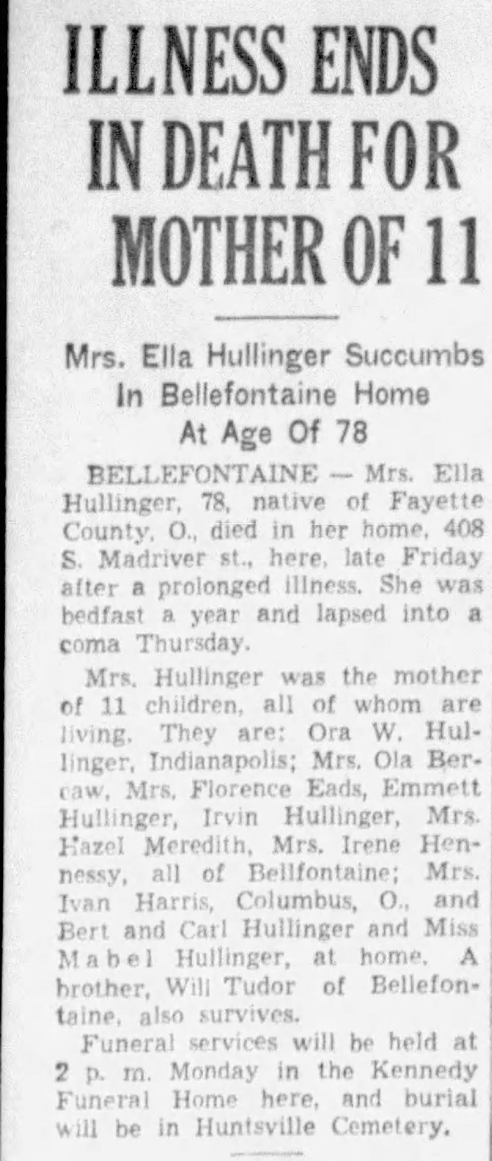 Mary Ella Tudor was born in 1864 in Fayette County, Ohio.1,2,3,4 As of 30 September 1885,her married name was Hullinger.1 She married Jason Patrick Hullinger, son of John Hullinger and Rebecca Branstetter, on 30 September 1885 at Logan County, Ohio.1,5,3,4 Mary Ella Tudor died on 28 August 1942 in Bellefontaine, Ohio.2,4 She was buried on 31 August 1942 at Huntsville Cemetery, Huntsville, Logan County, Ohio.2,4