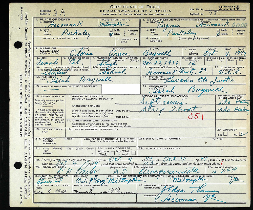Gloria Grace Bagwell was born on 23 November 1936 in Accomack County, Virginia.1,2 She was the daughter of Isaiah Darius Bagwell and Luvania Ola Justis.2 Gloria Grace Bagwell died on 4 October 1949 in Parksley, Accomack County, Virginia, at age 12.1,2 She was buried on 9 October 1949 at Metompkin Baptist Church Cemetery, Parksley, Accomack County, Virginia.1,2