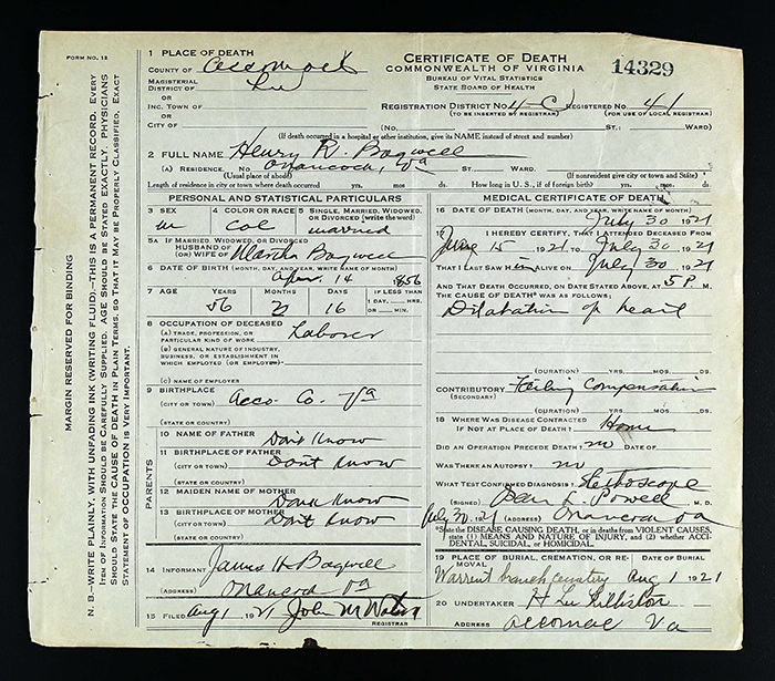 Henry R. Bagwell was born on 14 April 1856 in Accomack County, Virginia. He was the son of Emma Dix. Henry R. Bagwell married Martha Jane Blake on 28 November 1883 at Accommack County, Virginia. Henry R. Bagwell died on 30 July 1921 in Accomack County, Virginia, at age 65. He was buried on 1 August 1921 at Warrent Branch Cemetery, Accomack County, Virginia.
