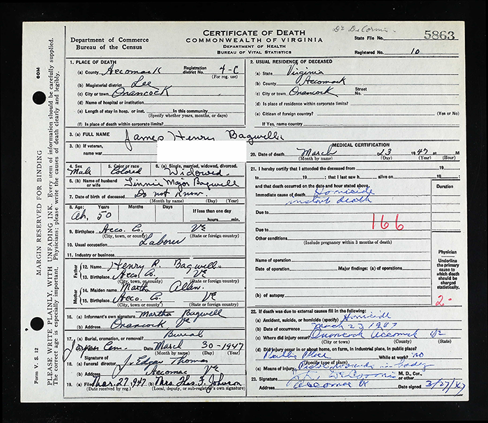 James Henry Bagwell was born on 1 October 1893 in Accomack County, Virginia, His birth date is recorded anywhere from 1893 to 1897. He was the son of Henry R. Bagwell and Martha Jane Blake. James Henry Bagwell married Tinnie Major on 6 January 1917 at Accomack County, Virginia. James Henry Bagwell died on 23 March 1947 in Onancock, Accomack County, Virginia, at age 53 and was murdered. He was buried on 27 March 1947 at Joynes Cemetery, Onancock, Accomack County, Virginia.