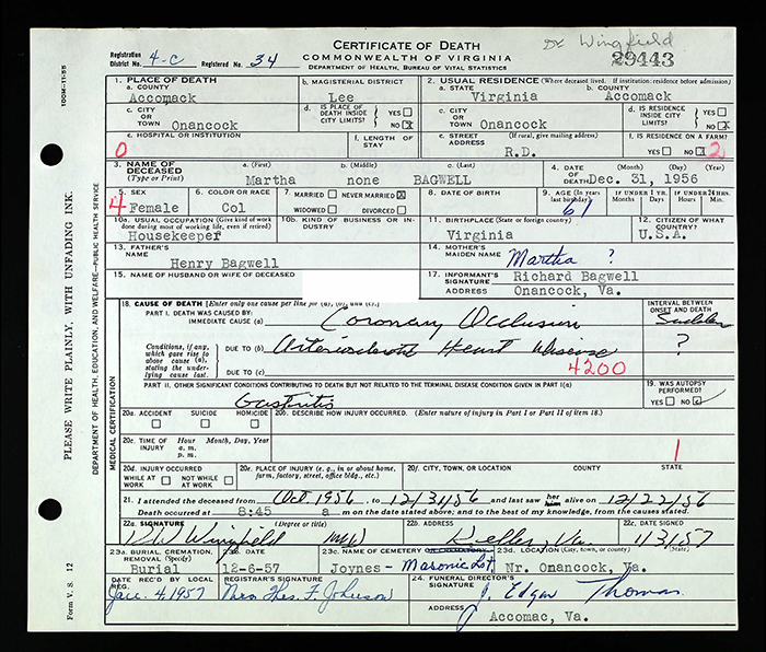 Martha Bagwell was born on 29 April 1890 in Accomack County, Virginia. She was the daughter of Henry R. Bagwell and Martha Jane Blake. Martha Bagwell died on 31 December 1956 in Onancock, Accomack County, Virginia, at age 66. She was buried on 6 December 1957 at Joynes Cemetery, Onancock, Accomack County, Virginia. She was unmarried.