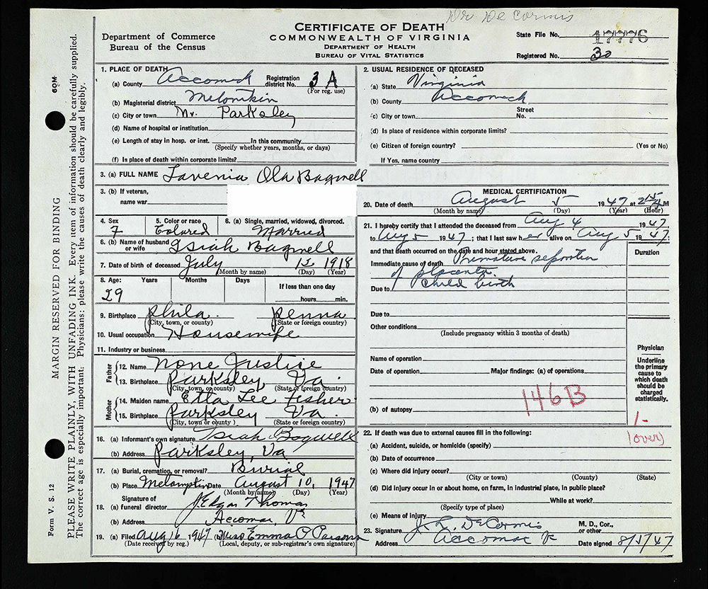 Luvania Ola Justis was also known as Lavenia Ola Justis. She was born on 12 July 1918 in Philadelphia, Philadelphia County, Pennsylvania.1,2 As of before 1936,her married name was Bagwell. She married Isaiah Darius Bagwell, son of Alfred Thomas Bagwell and Roxie Mae Dix, before 1936.2 Luvania Ola Justis died on 5 August 1947 in Parksley, Accomack County, Virginia, at age 29.1,2 She was buried on 10 August 1947 at Metompkin Baptist Church Cemetery, Parksley, Accomack County, Virginia.1,2