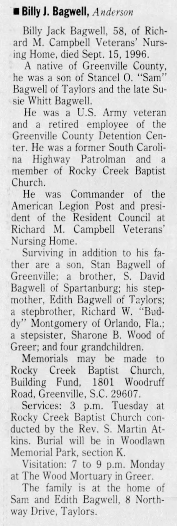 Billy Jack Bagwell was born on 20 April 1938 in Greenville, Greenville County, South Carolina. He was the son of Stancel Oscar Bagwell and Susie Irene Whitt. He was a SP4 in the US Army. Billy Jack Bagwell married Helen Claire Robinson on 19 February 1960 at Greenville, Greenville County, South Carolina. Billy Jack Bagwell married Wanda Pearl Chasteen. Billy Jack Bagwell died on 15 September 1996 in Anderson, Anderson County, South Carolina, at age 58. He was buried at Woodlawn Memorial Park, Greenville, Greenville County, South Carolina.